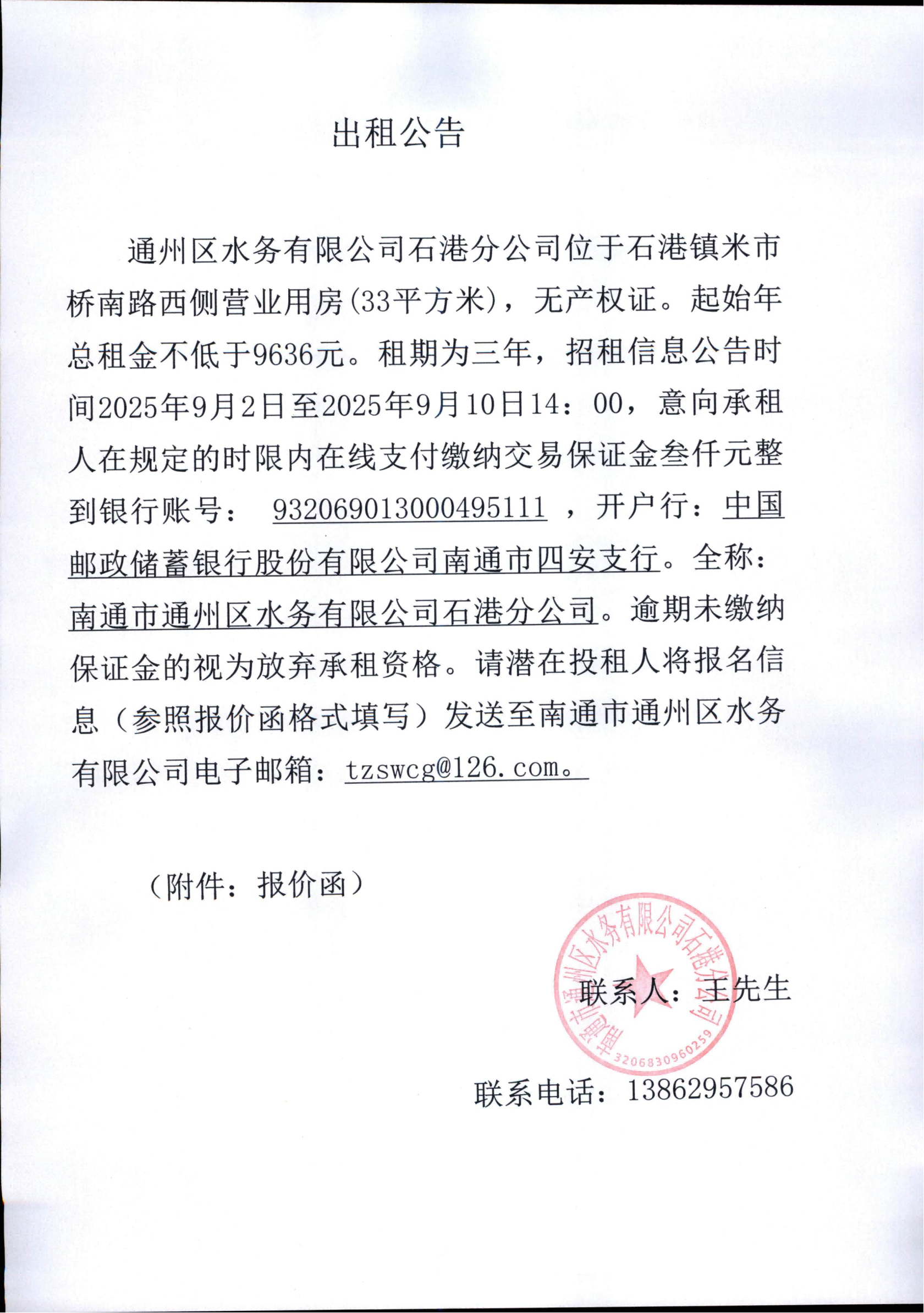 - 南通市通州區(qū)水務(wù)有限公司石港分公司米市橋南路西側(cè)營(yíng)業(yè)用房(33平方米)出租公告2025-09-01